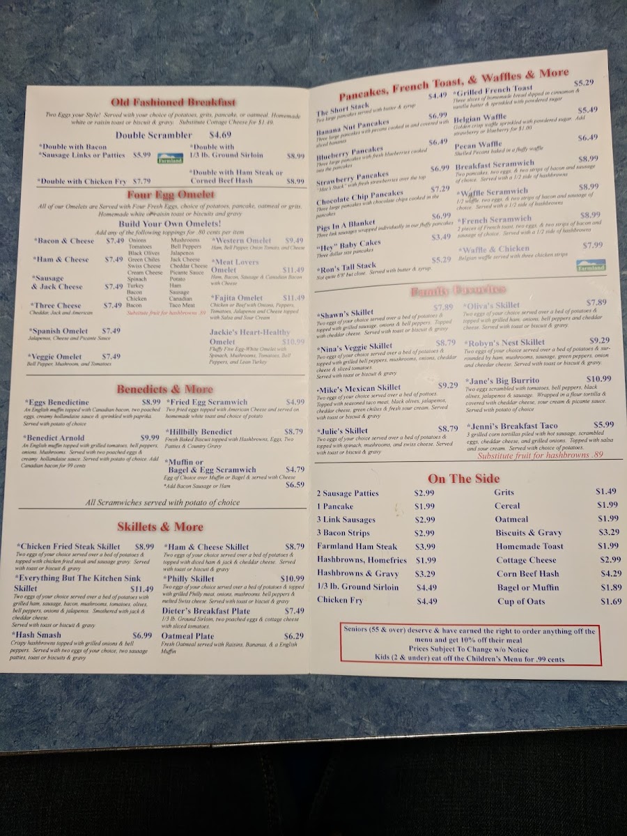 If you're in the mood for something more adventurous, their Skillets & More section is packed with flavor. The Philly Skillet brings a taste of Philly cheesesteak to your plate, while Robyn's Nest Skillet and Jake's Big Burrito are great choices for those looking for something unique. The Hash Smash is another tasty option, and for a lighter, handheld meal, try Jenni's Breakfast Taco.